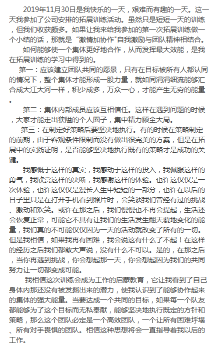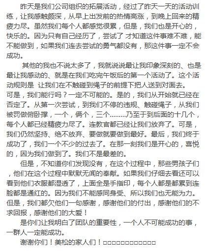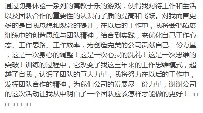本次活動(dòng),同事們?cè)趯?shí)踐鍛煉中學(xué)習(xí),在體驗(yàn)學(xué)習(xí)中改變,受益匪淺,有了更多的人生感悟。在體驗(yàn)著奉獻(xiàn)、協(xié)作、勇敢?guī)淼某晒ο矏偤?,每個(gè)人深刻感受到|溝通、責(zé)任、協(xié)作、勇敢、自信|的精髓,以及作為團(tuán)隊(duì)中的一員所要承擔(dān)的責(zé)任,正如美松智能總經(jīng)理黃楊靜先生及同事們所言,利用周日休息天還在撰寫感悟傳遞著: