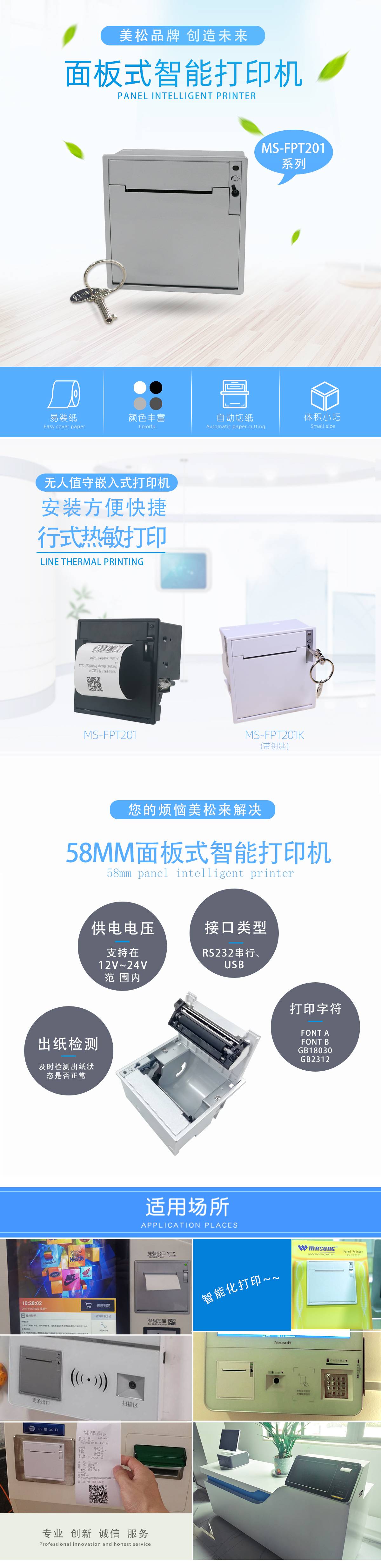 微型打印機(jī)特點(diǎn):前開蓋維護(hù),無(wú)需拆開終端設(shè)備就可實(shí)現(xiàn)換紙和維護(hù),配有鑰匙開蓋/電腦指令開蓋,有紙將盡傳感器檢測(cè),自動(dòng)切紙全半切設(shè)置,是一款無(wú)人值守內(nèi)嵌式熱敏品牌打印機(jī),支持黑白銀三種顏色,外殼可開發(fā)定制絲印各種顏色和圖文