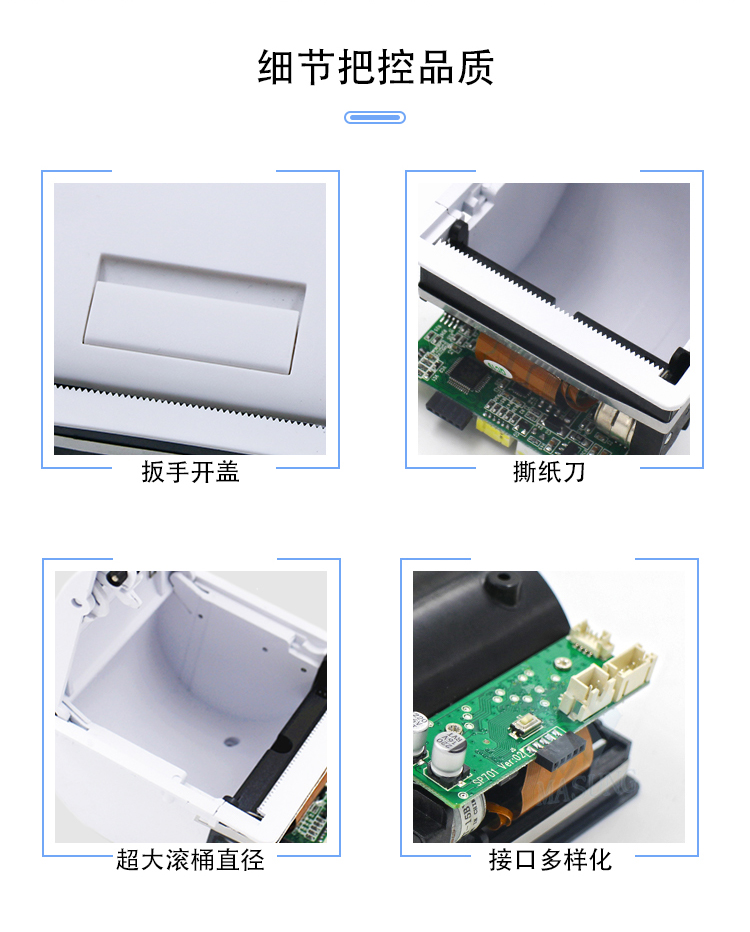 微型打印機(jī)特點(diǎn):前開(kāi)蓋維護(hù),無(wú)需拆開(kāi)終端設(shè)備就可實(shí)現(xiàn)換紙和維護(hù),8V~12V低電壓供電58mm打印機(jī),嵌入體積小巧