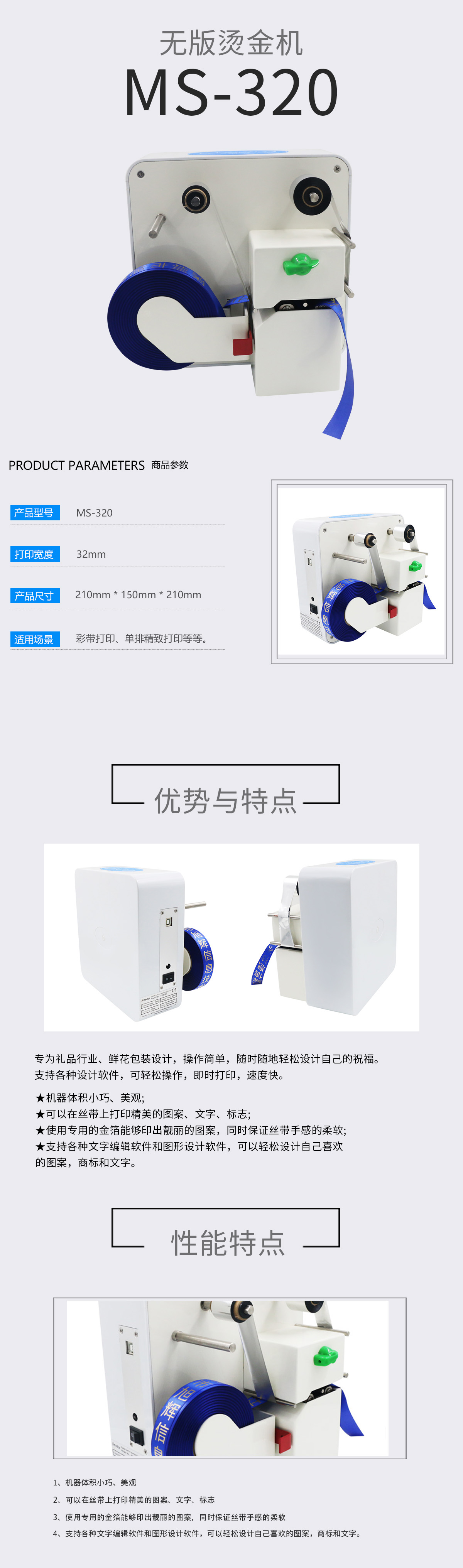美松MASUNG全自動絲印機是針對絲帶飄帶全自動絲印的一種印花設備,在絲帶上打印精美的圖案,文字,標志,專為禮品行業(yè),鮮花包裝設計隨時隨地輕松設計自己的祝福.操作簡單,支持各種設計軟件,可輕松操作,即時打印,速度快.使用專用的金箔能夠印出靚麗的圖案,同時保證絲帶手感的柔軟,支持各種文字編輯軟件和圖形設計軟件,自定義打印商標和文字.