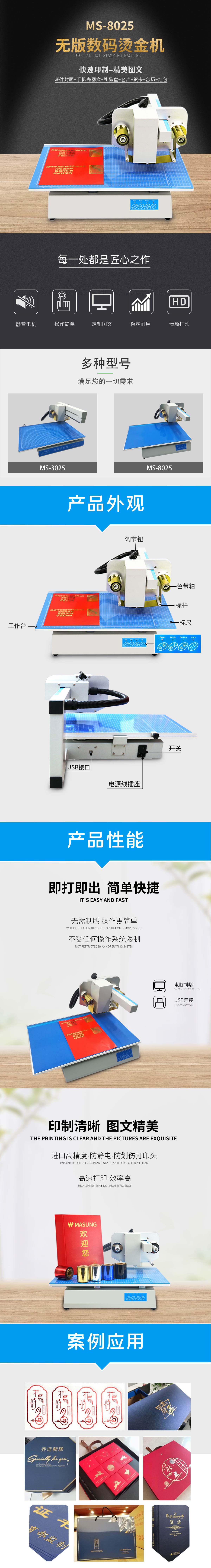 美松無版數(shù)碼燙金機MS-8025采用日本原裝rohm打印頭,最新設(shè)計徹底取代傳統(tǒng)的燙金機。身材小巧、節(jié)約空間重量、方便移動;最大打印厚度可達30mm、用途廣泛。軟件控制、可加工復雜圖案文字照片等,可在不光滑的卡紙、皮革上燙印各種圖案文字。用戶無需制版、開模,功率低,經(jīng)濟快捷,簡單操作,一看即懂,輕松自如。