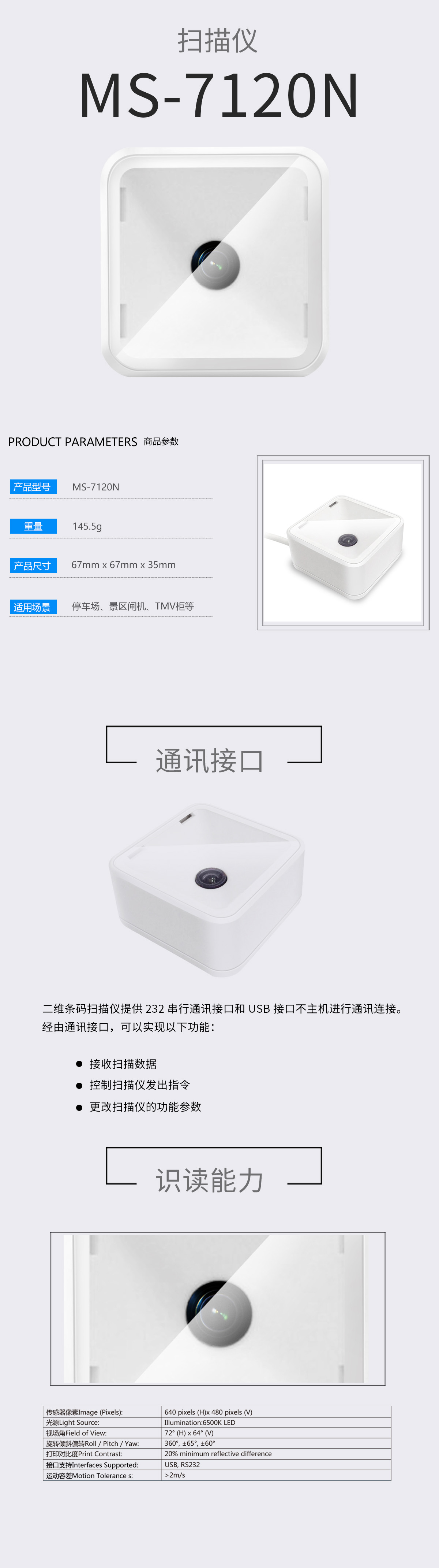 美松二維碼掃描器MS-7120N掃描器采用CMOS全局曝光圖像傳感器,支持移動過程中的識讀,全面兼容主流一維碼,二維碼.同時支持紙質條碼和電子屏條碼的識讀.掃描成功有蜂鳴器和指示燈提示,外觀設計整潔,精致,可內嵌亦可外置.MS-7120N二維碼掃描器得益于二維影像技術及優(yōu)秀的Hercules與專利技術,可以非常容易且準確地識 讀條碼符號,即使條碼符號處于任意旋轉角度,都不會影響識讀.在掃碼時,將掃描儀投射的瞄準指示光束對準所需讀取的條碼符號上即可.