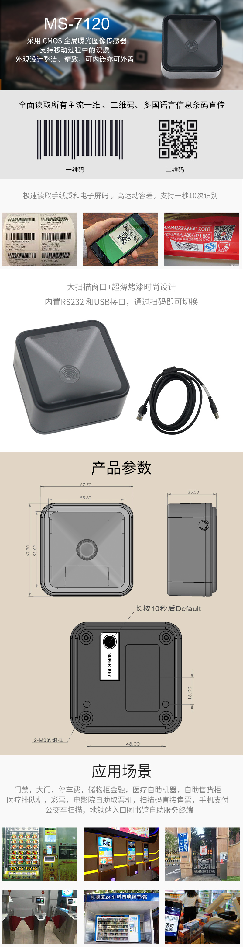 美松二維碼掃描器 1.全面讀取所有主流一維 ,二維碼,多國語言信息條碼直傳 2.物體自感應,2M/S運動容差,支持陽光下識讀 3.內置RS232 和USB接口,通過掃碼即可切換 4.3.3-5V寬電壓輸入,無懼電壓波動 5.大掃描窗口&超薄烤漆時尚設計 6.極速讀取手紙質和電子屏碼
