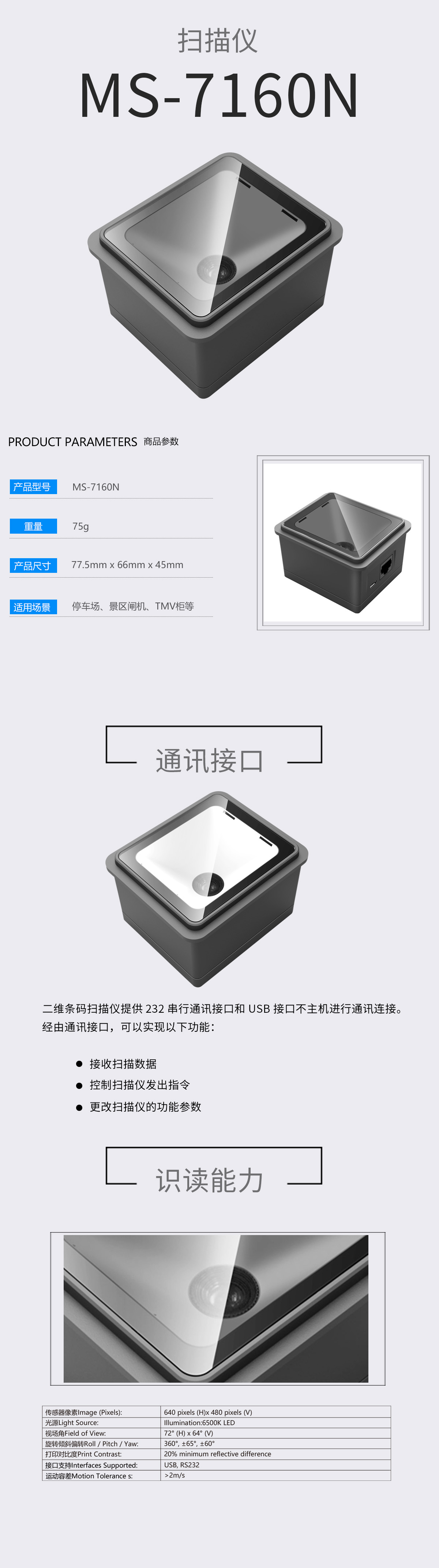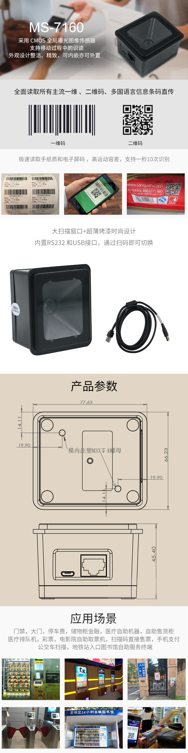 美松嵌入式掃描模塊MS-7160N掃描物體自感應(yīng),多國語言條碼信息直傳,內(nèi)置RS232和USB接口,大視角影像感光器,支持紙質(zhì)條碼和無背光屏幕條碼讀取,二維碼掃描平臺,嵌入式掃描模塊,電子支付盒固定式掃碼盒可二次開發(fā).全面讀取所有主流一維 ,二維碼,多國語言信息條碼直傳;物體自感應(yīng),2M/S運動容差;內(nèi)置RS232 和USB接口,通過掃碼即可切換;3.3-5V寬電壓輸入,無懼電壓波動;大掃描窗口+超薄烤漆時尚設(shè)計;極速讀取手紙質(zhì)和電子屏碼。