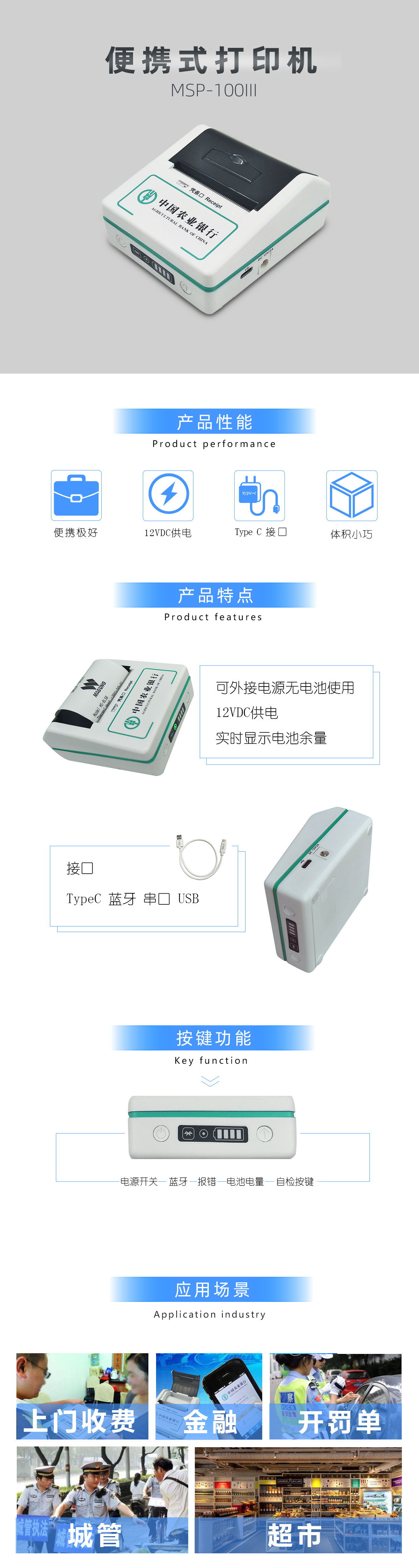 美松MASUNG自主研發(fā)便捷式打印機 1.ESC/POS?標準的命令協議 2.12VDC供電,可外接電源無電池使用 3.支持TypeC,藍牙,串口,USB接口 4.支持位圖打印,條形碼打印