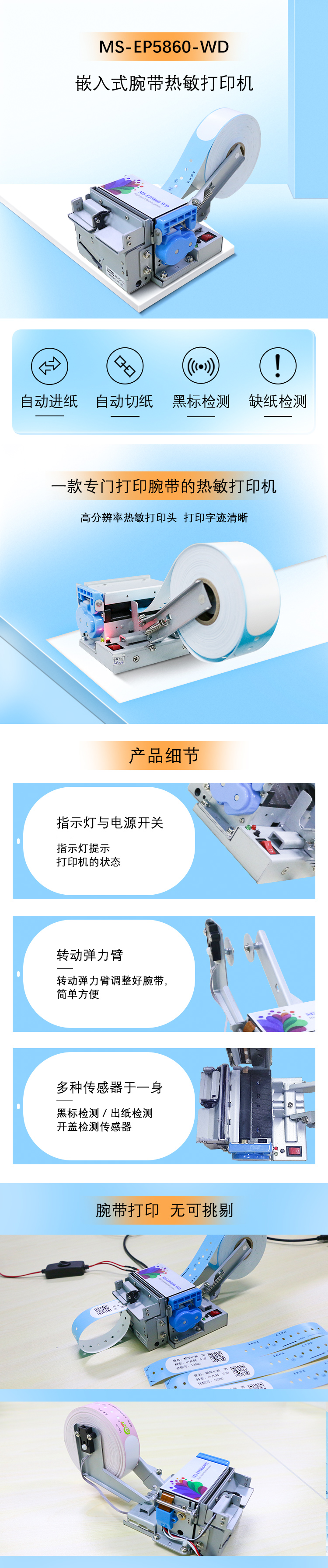 MS-EP5860-WD 是一款專門打印腕帶的熱敏打印機,特點如下: