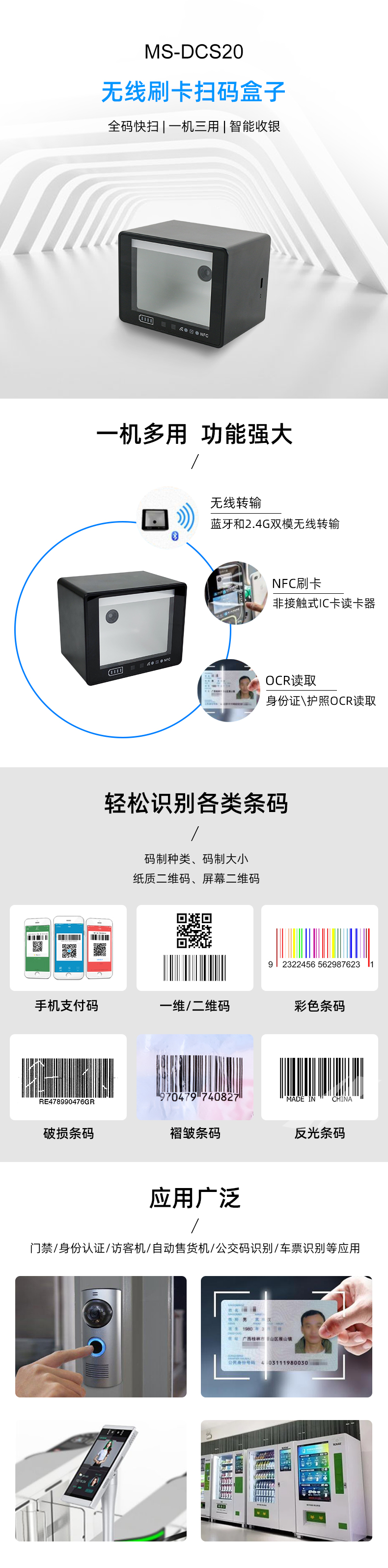 二維碼掃描器行業(yè)應(yīng)用:二維碼掃描器MS-DCS20可桌面亦可嵌入、會議簽到、訪客機(jī)、門禁、身份認(rèn)證、身份證護(hù)照OCR讀取,支付、醫(yī)療自助、排隊機(jī)等,尤其適用于高密紙質(zhì)、手機(jī)碼、要求貼近掃描、需要讀身份證OCR、刷IC卡、無線傳輸應(yīng)用的場景。二維碼掃描器MS-DCS20實現(xiàn)藍(lán)牙和2.4G雙模傳輸;選配刷卡模塊可支持13.56Mhz 非接觸式 IC 卡讀卡器,支持 Type A/B 卡識讀;OCR讀取可讀取OCR-A/B數(shù)字,領(lǐng)先的解碼技術(shù),采用自主研發(fā)的核心技術(shù),極速響應(yīng),支持快速開發(fā)和定制需求。