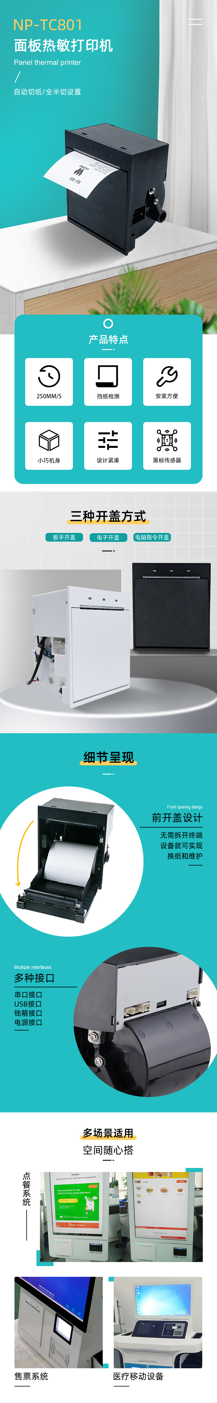 1.擁有易裝紙、滑動式自動切紙等功能;擁有多種安裝方式 2.紙將盡可手動調節(jié)大小,最精確的紙將盡檢測(可精確張數) 3.按開蓋扳手;通過開蓋按鍵 ;電腦發(fā)送開蓋指令 4.帶有堵紙器檢測狀態(tài);多樣傳感器協(xié)助控制 5.無人值守內嵌式熱敏打印機 6.醫(yī)療、政務、零售、餐飲、加油站等行業(yè)的自助終端打印設備