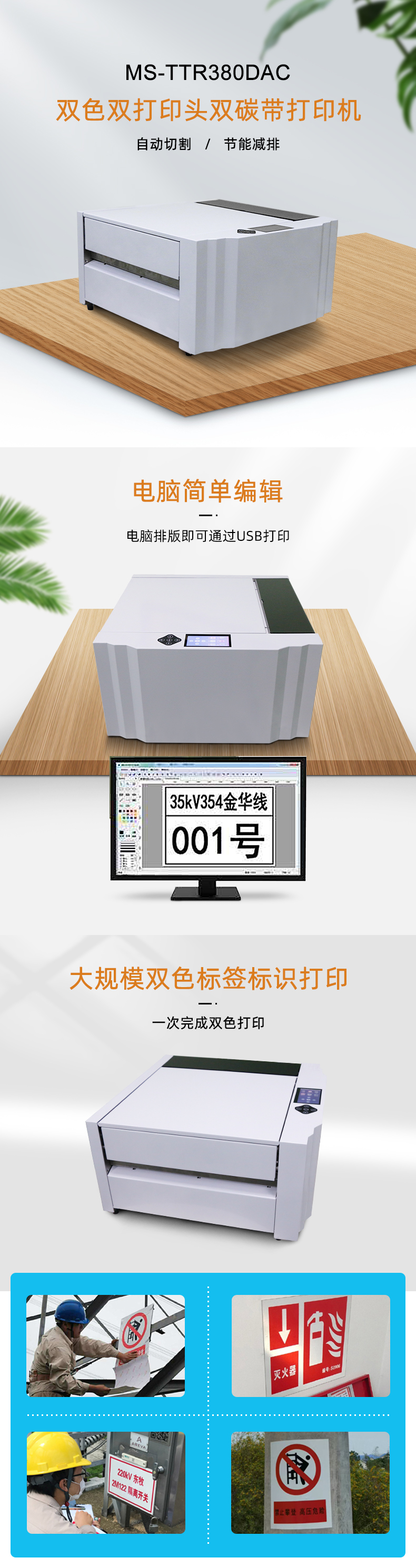 美松MASUNG自主研發(fā)熱轉印雙色標識牌打印機 1.打印大幅面標示牌,且自動切割 2.無需制版,電腦排版完通過USB打印,方便快捷 3.碳帶熱轉印方式打印,文字清晰耐刮永不褪色 4.支持PVC+貼合鋁箔復合材料、PVC標識貼紙材料等打印 5.熱轉印打印防水防曬耐腐蝕,經久耐用