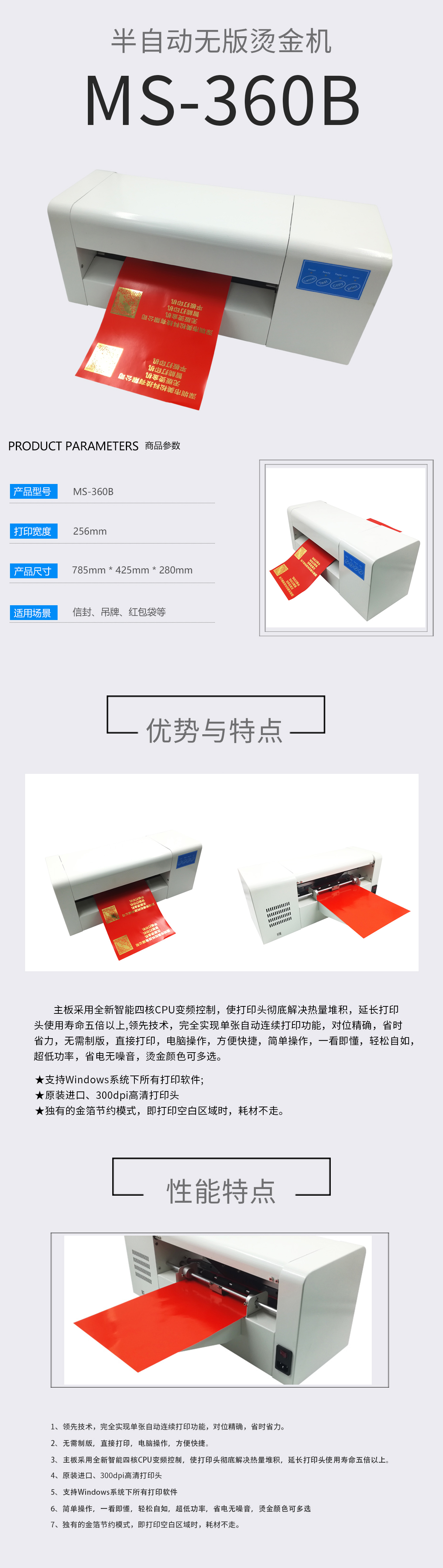 美松數碼無版燙金印花機 1.完全實現了單張自動進紙功能,省時又省力 2.直接usb,U盤輸出,無需制版直接打印電腦操作方便快捷 3.可連續(xù)打印卷材,即打即用,省時省力 4.全新智能四核CPU變頻控制,使打印頭徹底解決熱量堆積,延長打印頭使用壽命五倍以上
