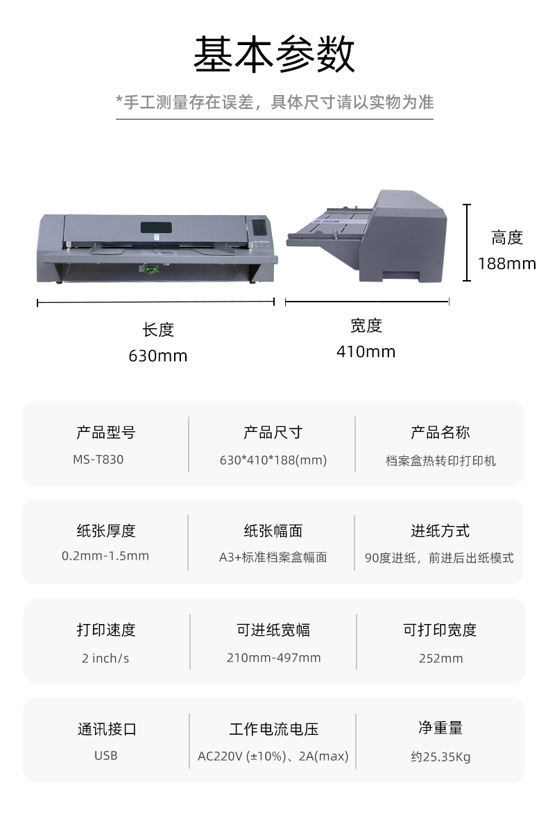 美松MS-T830檔案盒熱轉(zhuǎn)印打印機,熱轉(zhuǎn)印設(shè)備,熱轉(zhuǎn)印機器針對已印刷的檔案盒封面進行二次加印,或單張空白版面牛皮紙,無酸紙,證件內(nèi)頁進行打印的設(shè)備.采用碳帶熱轉(zhuǎn)印方式打印,文字清晰耐刮永不褪色.電腦排版完即可通過USB打印無需制版,A3+標準檔案盒幅面,方便快捷成本低廉,機構(gòu)可靠性高,操作,維護簡單.適用于公檢法,檔案局,審批局,醫(yī)療診所,教育機構(gòu),煙草,房產(chǎn)管理,電力,鐵路等行業(yè)。