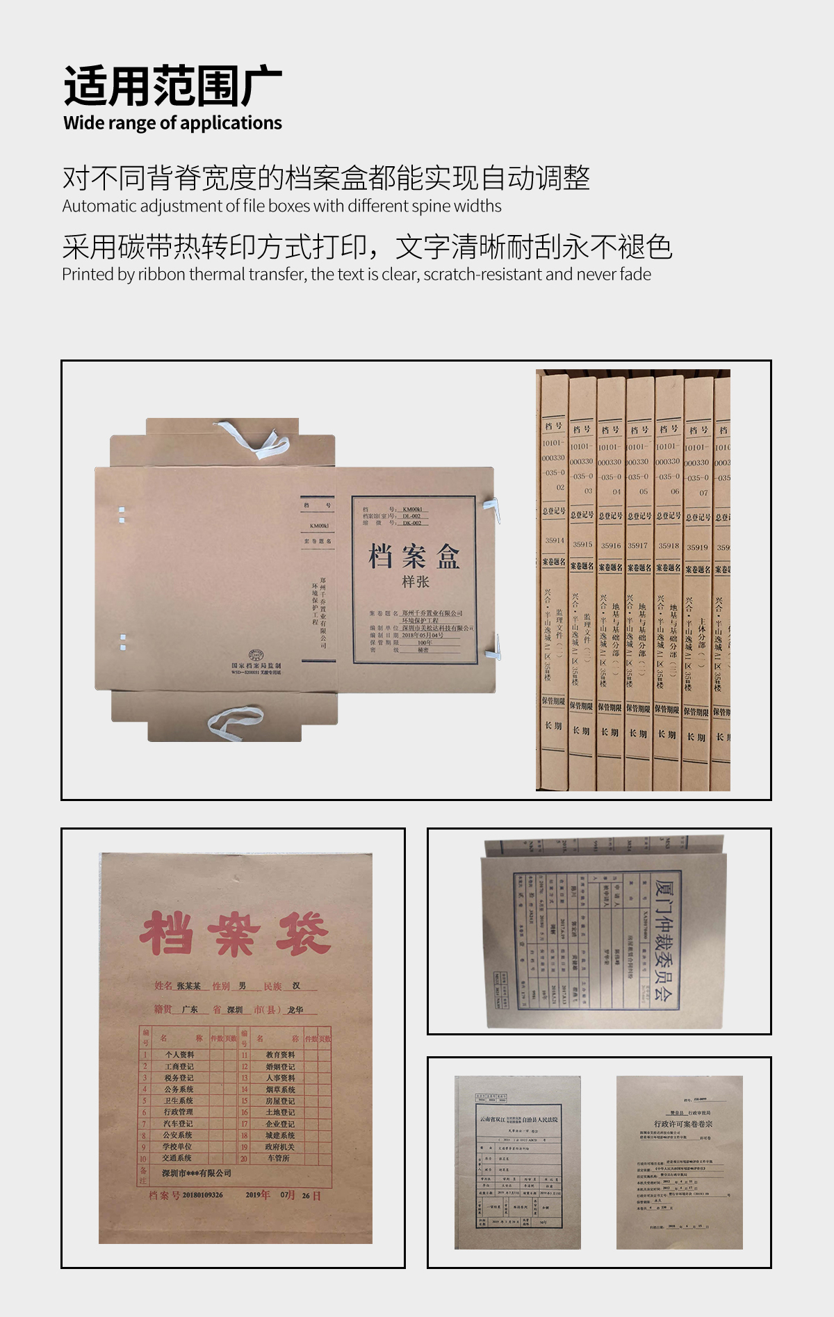 熱轉(zhuǎn)印打印機原理:熱轉(zhuǎn)印技術(shù)利用碳帶介質(zhì)通過熱敏片遇熱和壓力轉(zhuǎn)印到紙或薄膜的過程,當(dāng)卷宗卷皮的單張空白版面牛皮紙,無酸紙,證件內(nèi)頁紙通過打印機的打印頭和壓軸時,將碳帶上的碳粉轉(zhuǎn)印到標(biāo)簽上, 最終形成文字或圖案。