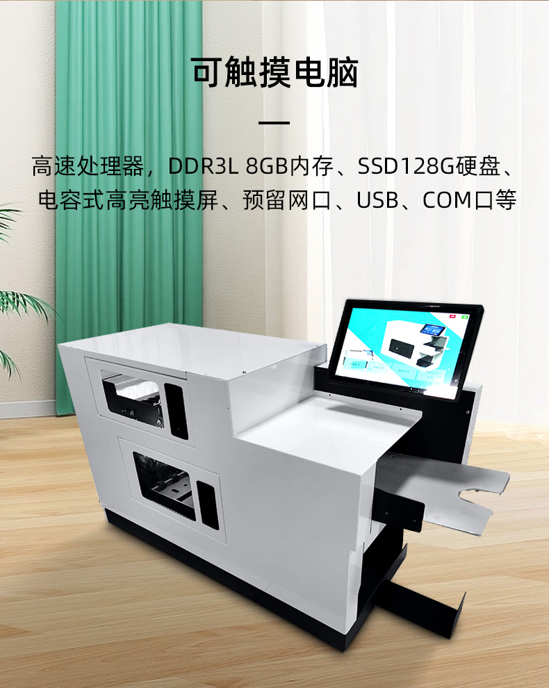 可觸屏的電腦具有高速處理器,DDR3L 8GB內(nèi)存、SSD128G硬盤、電容式高亮觸摸屏、預(yù)留網(wǎng)口、USB、COM口等