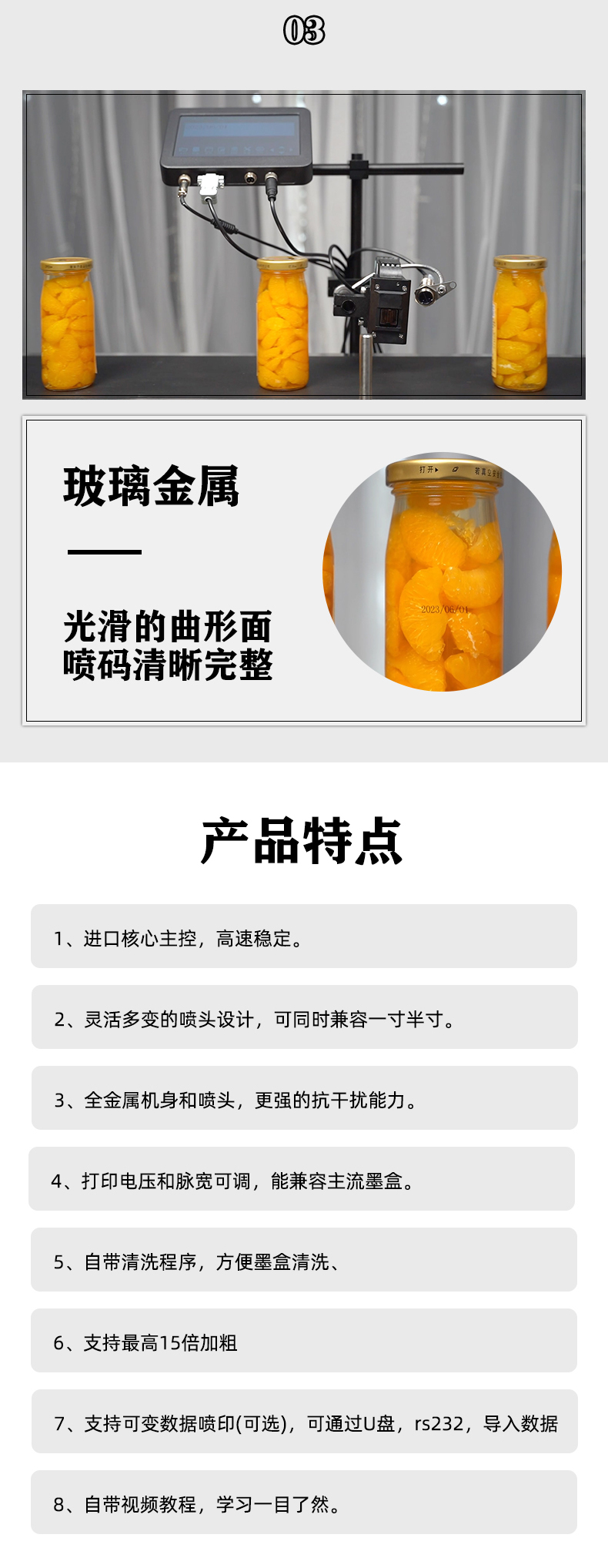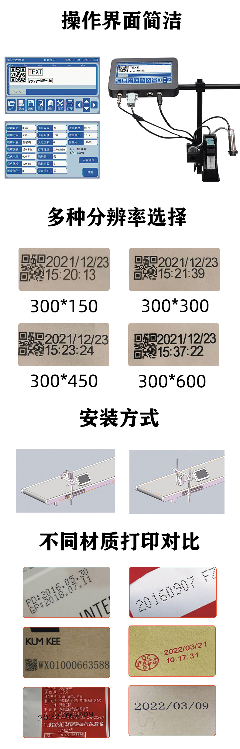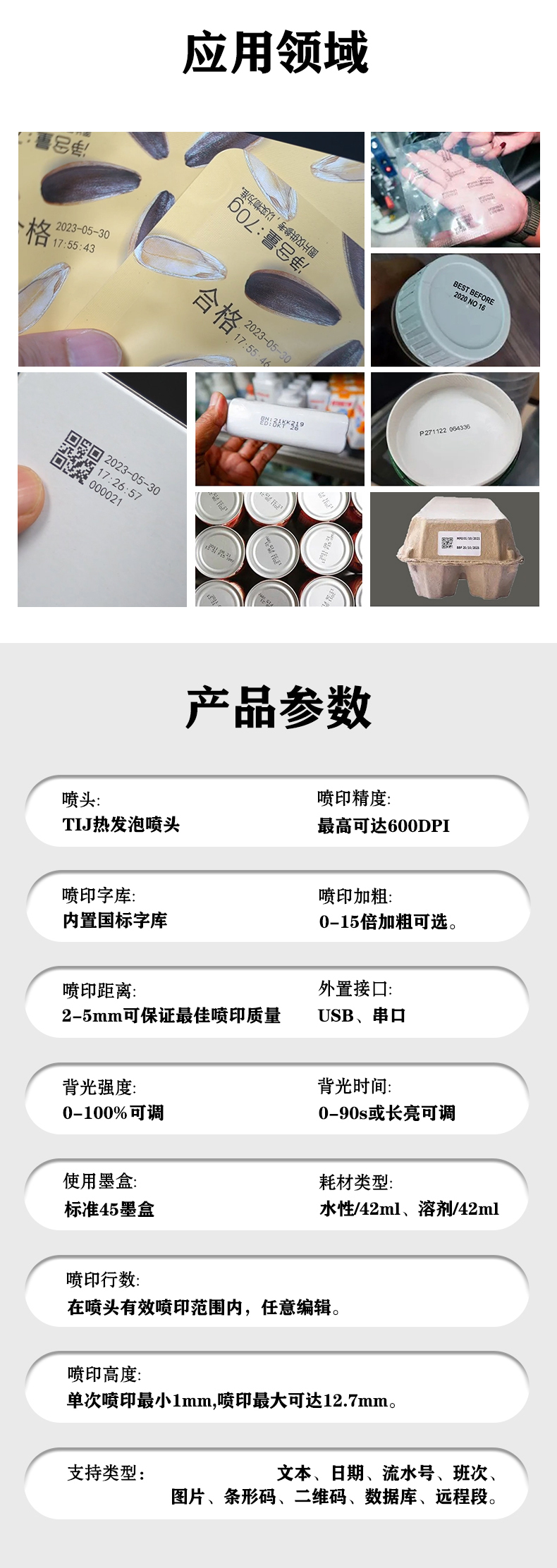 7、支持可變數(shù)據(jù)噴印(可選),可通過(guò)U盤,rs232,導(dǎo)入數(shù)據(jù)