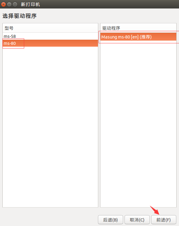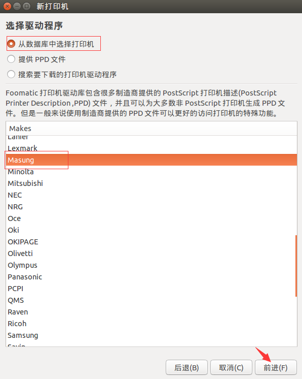 選擇 “從數(shù)據(jù)庫中選擇打印機(jī)”,并選擇 “Masung”,然后點(diǎn)擊前進(jìn)。