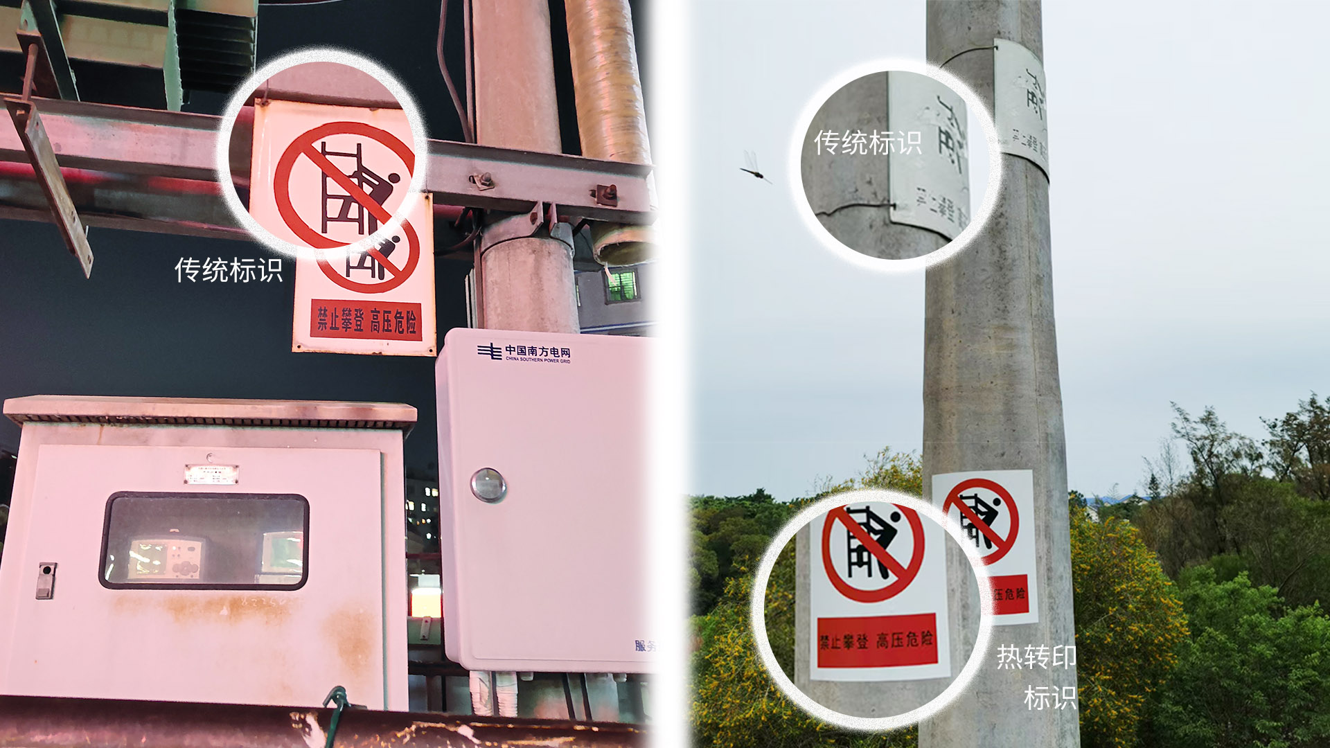 熱轉(zhuǎn)印技術(shù)的創(chuàng)新,在標(biāo)識(shí)制作領(lǐng)域掀起了一場(chǎng)變革。傳統(tǒng)搪瓷、鋁合金、不銹鋼標(biāo)識(shí)造價(jià)高、生產(chǎn)周期長(zhǎng)、使用壽命短、不能重復(fù)利用且材料材質(zhì)不統(tǒng)一,給電力電網(wǎng)、鐵路交通、公路等各行業(yè)的標(biāo)識(shí)管理帶來(lái)巨大困擾。美松通過(guò)自主創(chuàng)新,為標(biāo)識(shí)應(yīng)用領(lǐng)域帶來(lái)了智能、高效、節(jié)約的創(chuàng)新管理模式。下圖是熱轉(zhuǎn)印標(biāo)牌替換傳統(tǒng)工藝制作的標(biāo)牌對(duì)比圖。